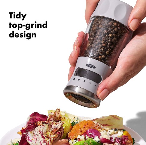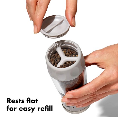The sleek and stylish OXO Good Grips Pepper Grinder is an ideal addition to any kitchen or dining table. This manual Grinder has stainless steel accents and a clear acrylic body, so you’ll know when it’s time to refill. Rotate the tab to choose one of five levels of grind, from fine to coarse. An airtight lid keeps peppercorns fresh and dry while the non-slip grip allows for easy, comfortable use. Grind and serve from the top for mess-free storage. Comes pre-filled with black peppercorns. Hand-wash only.